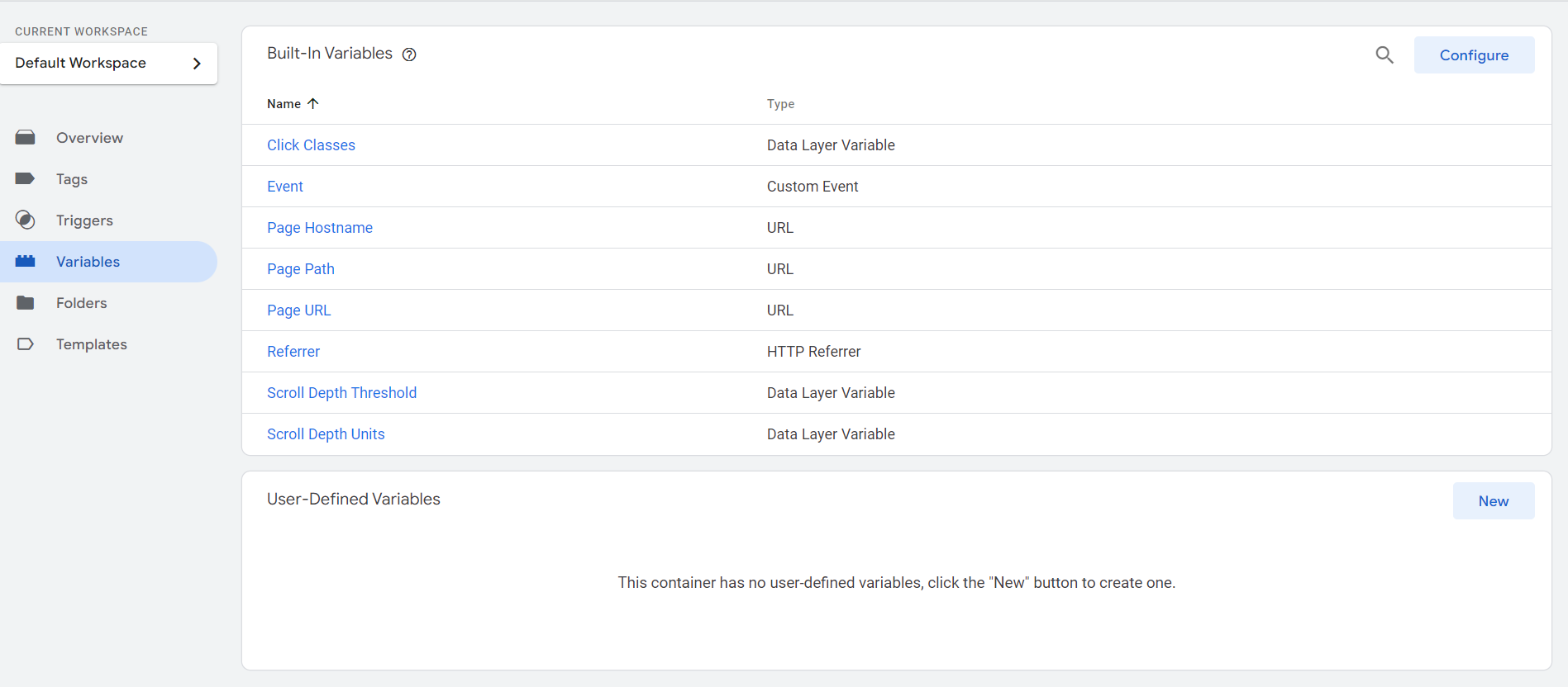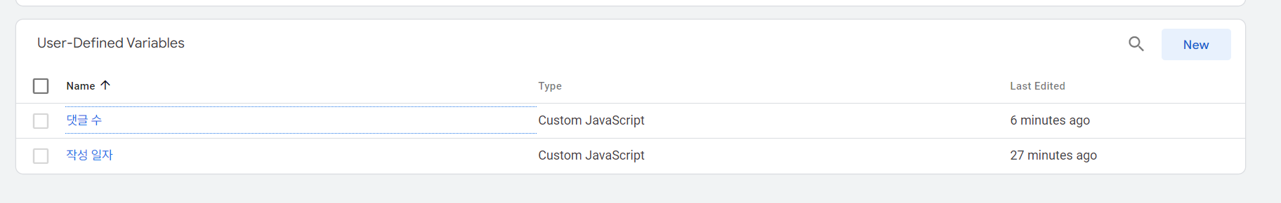 이제 이 정의를 변수에서 직접 진행하게 되는 것입니다. GTM의 메뉴에서 [Variables]로 가보겠습니다. Built-in Variables도 확인이 가능합니다. 우리가 스크롤 이벤트에서 사용했었던 "Scroll Depth Threshold"도 보입니다. 이 값 역시 동적 변수의 하나입니다. 해당 트리거 발동 시점의 스크롤 뎁스 비율을 리턴한다는 의미겠죠? 이제 이러한 형태의 변수를 직접 만들어 보겠습니다. 하단의 [New] 버튼을 클릭합니다.