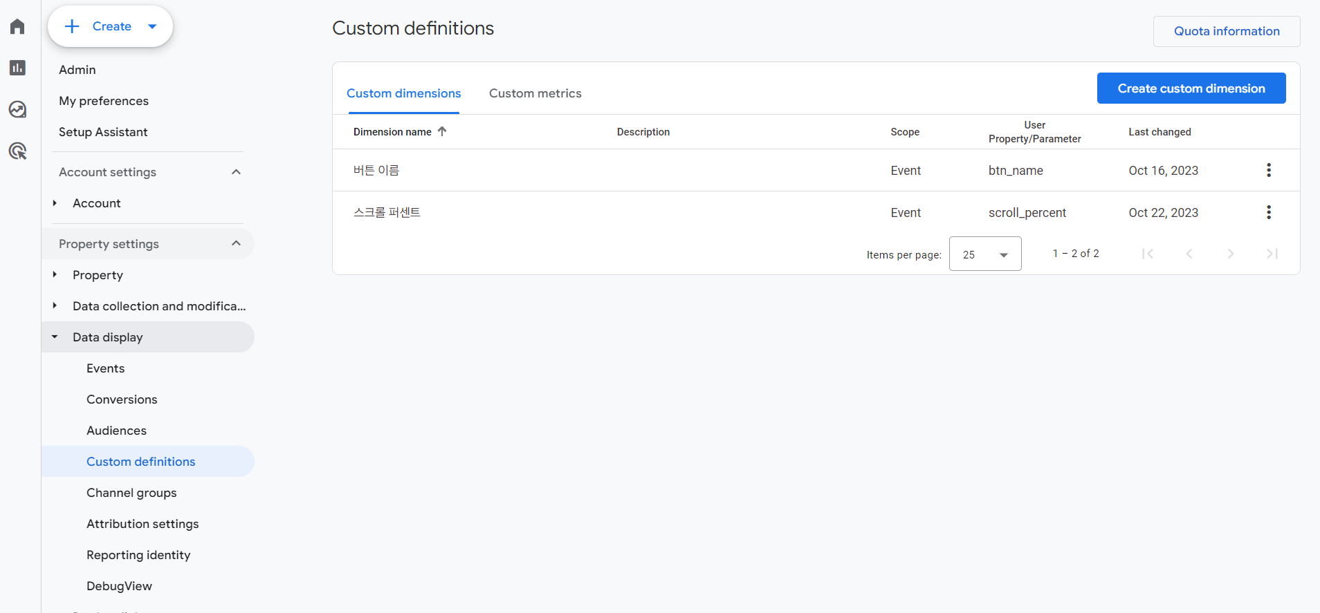 참고로 위 두개의 새로 추가된 event parameter 역시 custom dimensions로 추가가 가능합니다. [Custom definitions] 메뉴에서 추가를 진행합니다.