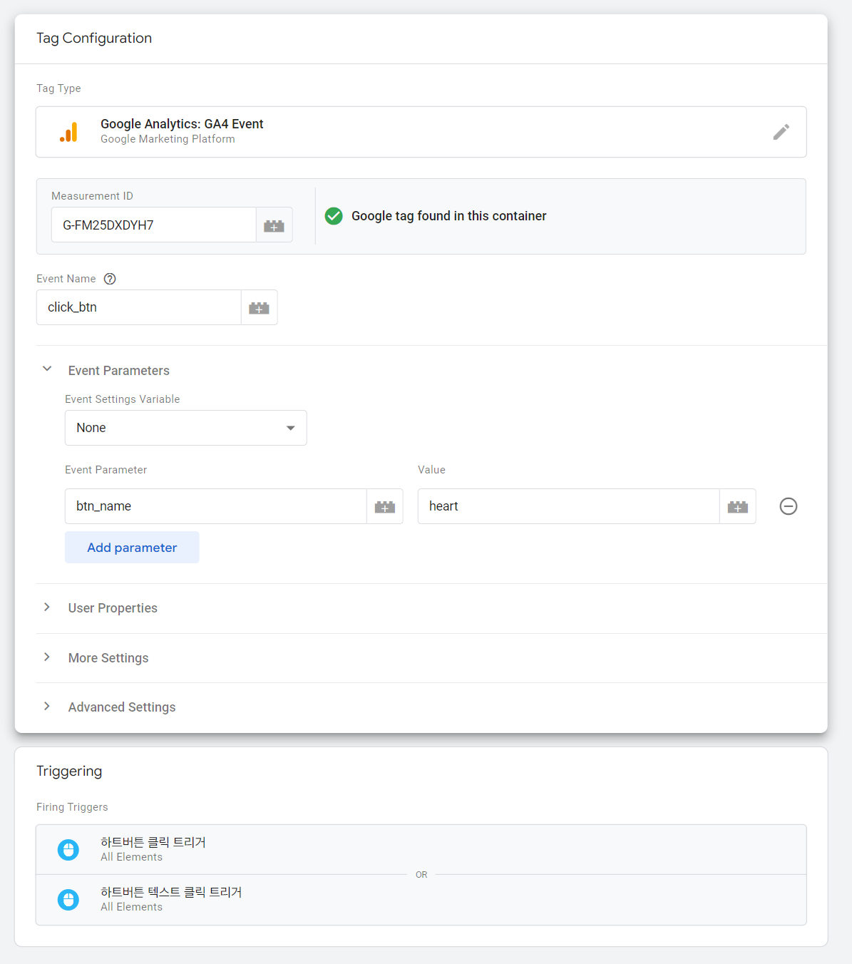 이제 우리는 동적 변수를 직접 정의해서 생성하고, 해당 동적 변수를 우리가 새로 선언하는 이벤트 파라미터의 값으로 할당하는 절차를 거칠 예정입니다. 예를 들어 파라미터 [btn_name]의 value는 'heart'라는 스트링 값으로 지정했습니다. 하지만 이 value 영역이 상황에 따라 바뀌는 값이어야 한다면, 해당 value는 "특정 조건에 따라 값을 리턴하라"라는 값이 되어야 합니다.