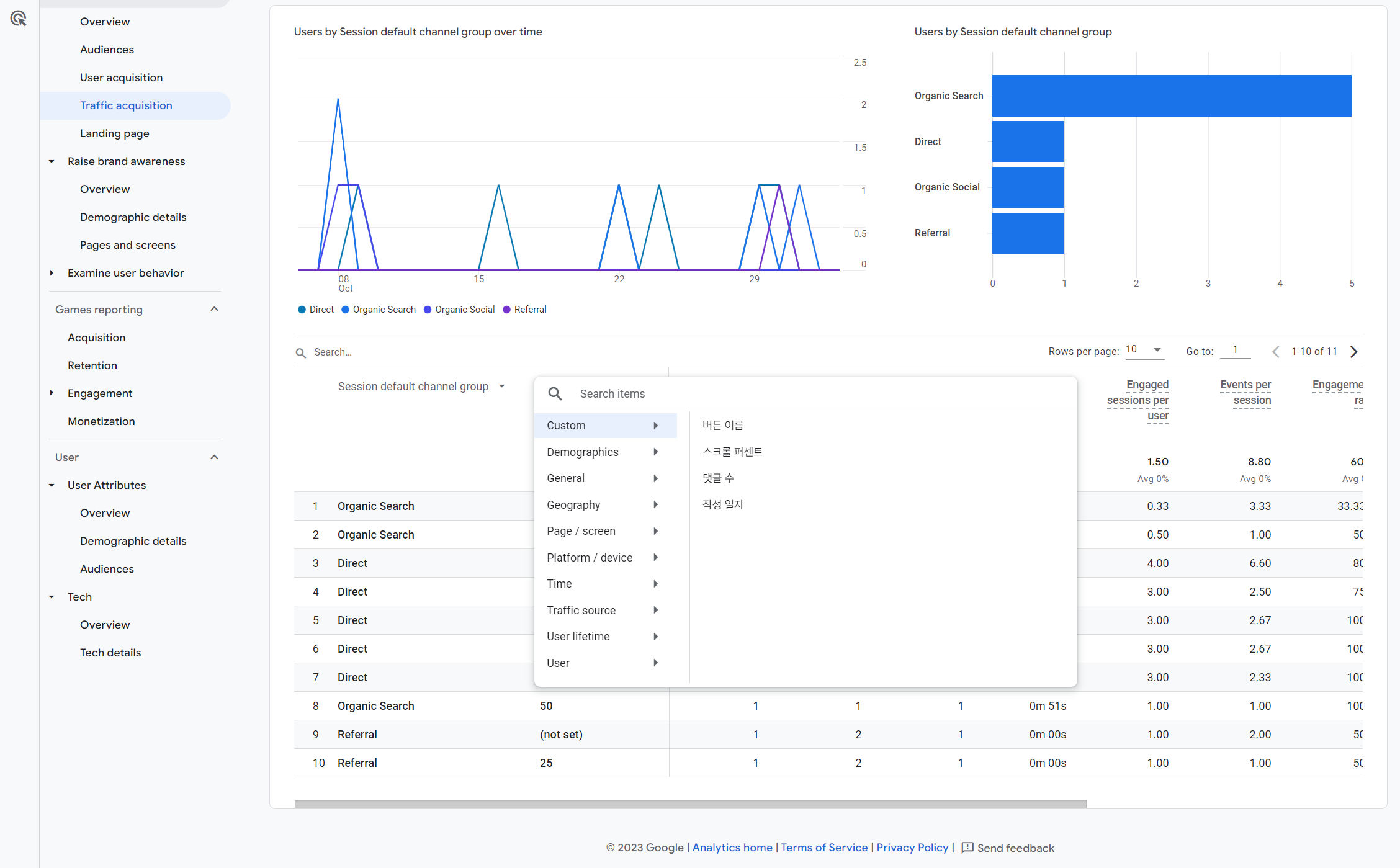 | 7. GA4 데이터 분석하기 : Explorations (1) - 테이블 차트 (1) | 2023.11.08 |