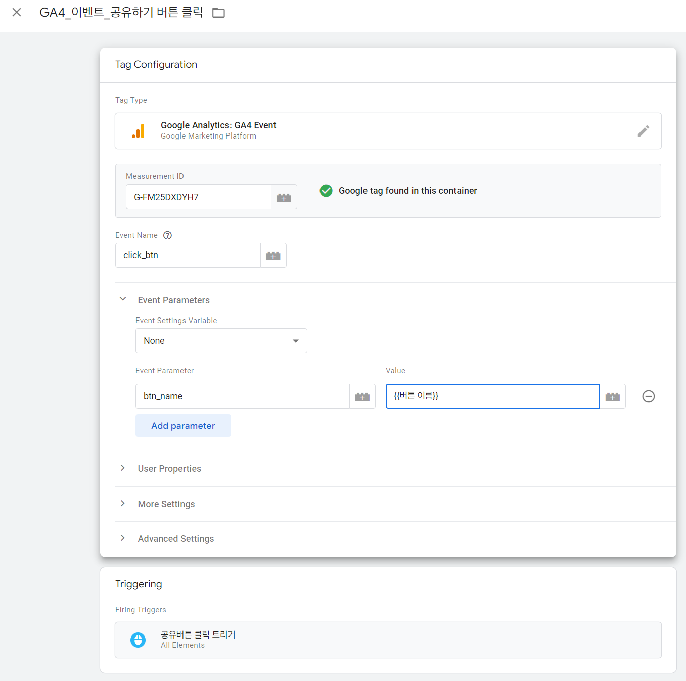 이제, [버튼 이름]이라는 동적 변수를 이벤트에 실제로 적용합니다. 우선 하트 버튼 클릭 이벤트의 [btn_name] 파라미터의 값을 수정합니다.