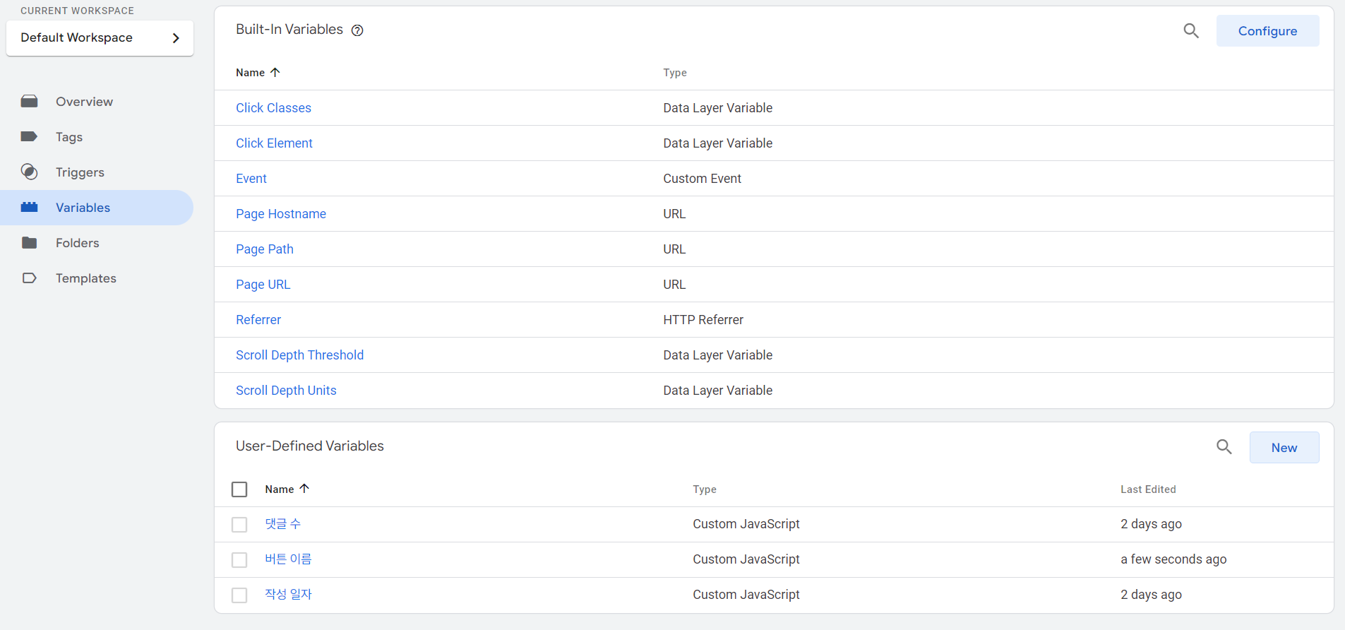 맨 위의 _event / _triggers / _url 을 제외한 모든 변수들은 지금 우리 GTM에 등록되어 있는 모든 변수입니다. 직접 만든 변수인 [댓글 수], [작성 일자]도 확인되네요.