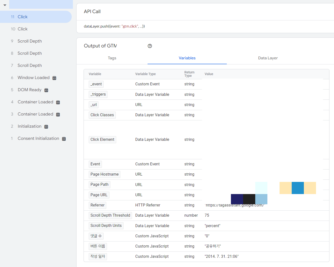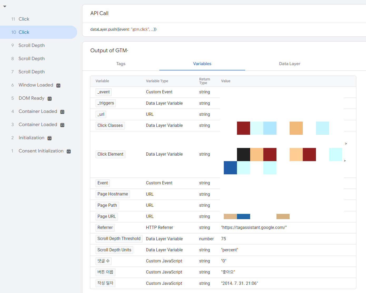 이제 Tag Assistant 탭으로 돌아와 보겠습니다. 좌측 메뉴 탭에는 해당 페이지에서 수행된 모든 이벤트가 1번부터 차례로 기록되어 있습니다. 그리고 위에 'Click' 이벤트가 있는 것을 확인할 수 있습니다. 이 이벤트를 클릭하면, 하나의 이벤트에 대한 여러 정보가 작성되는 것을 알 수 있습니다.