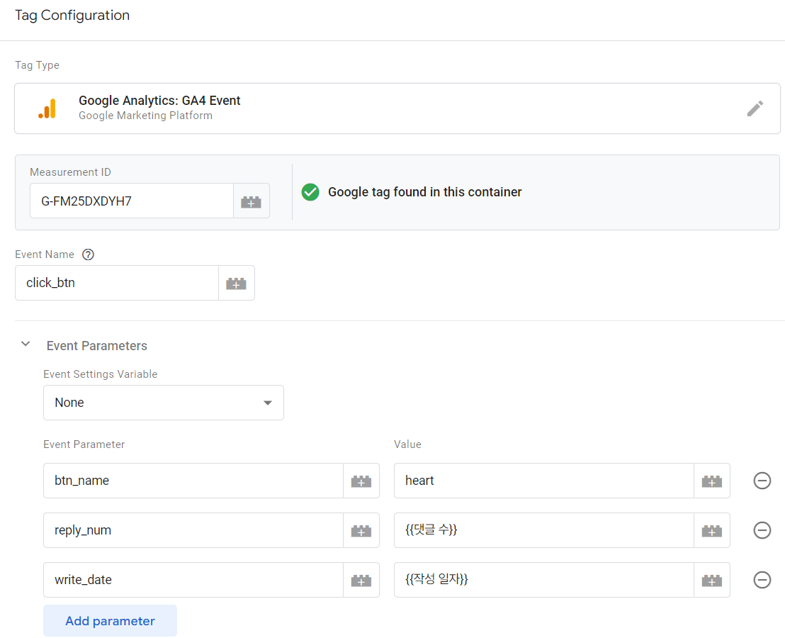 현재 우리가 생성해 둔 [click_btn] 이벤트에는 'btn_name'이라는 event parameter가 있습니다. 이 값이 'heart'라는 스트링 값으로 지정되어 있는데, 이 value를 Javascript를 이용해 동적 변수를 적용한 reply_num, write_date와 같이 "클릭한 버튼의 이름" 텍스트를 리턴하는 동적 변수로 만들어 봅시다.