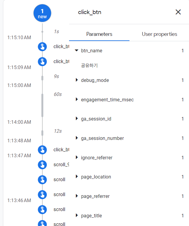 디버거 ON 후, 해당 좋아요와 공유하기 버튼을 클릭했을 때 아래와 같이 디버그 뷰에서 btn_name 이벤트 파라미터가 잡히는 것을 확인할 수 있습니다.