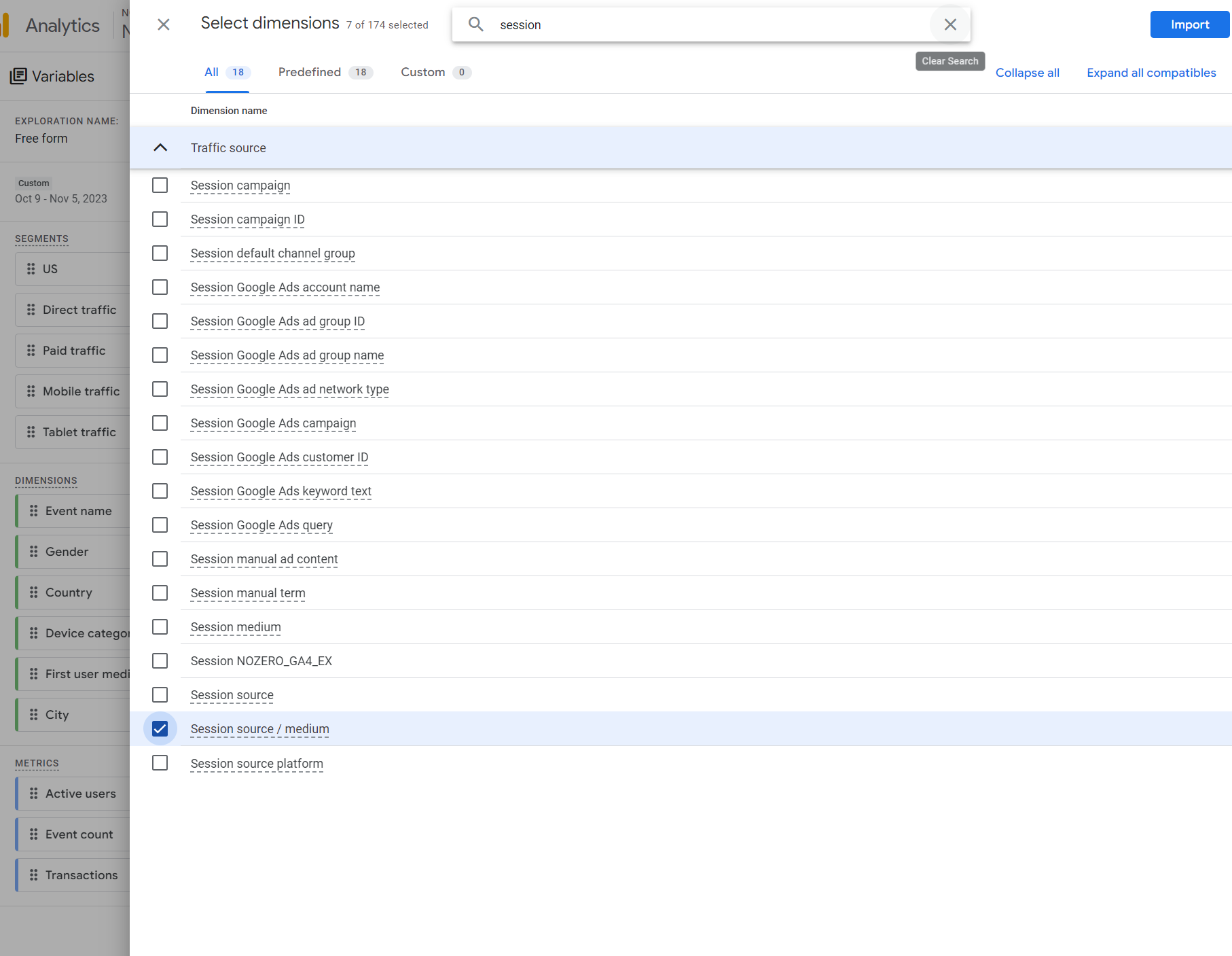 하나씩 살펴보겠습니다. 우선 "Session source / medium"을 ROWS에 할당해 데이터를 조회해야 합니다. ROWS에 적용하는 것은 Dimension이죠? 여기에 세션 소스 / 매체를 추가하겠습니다.