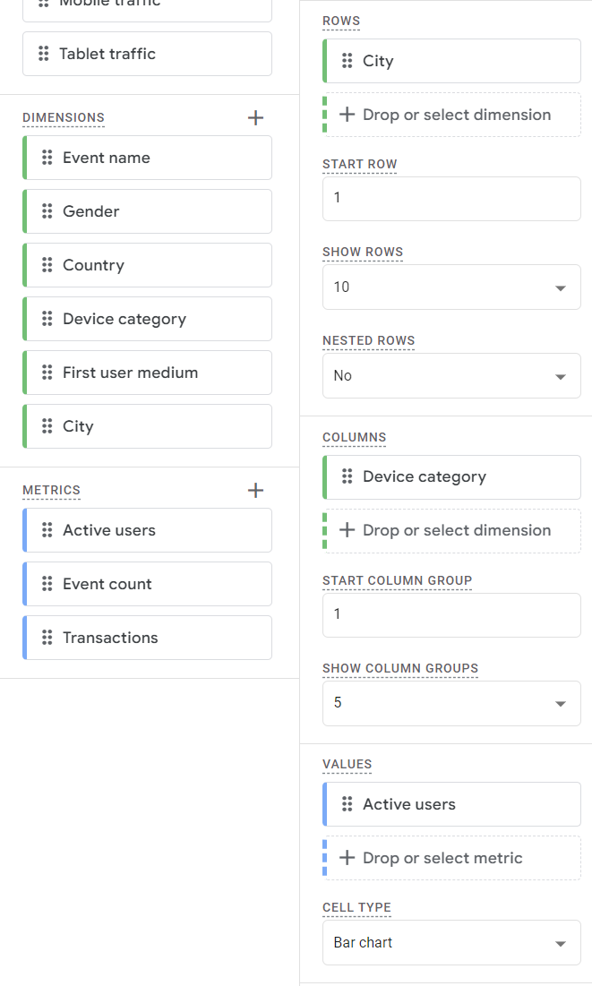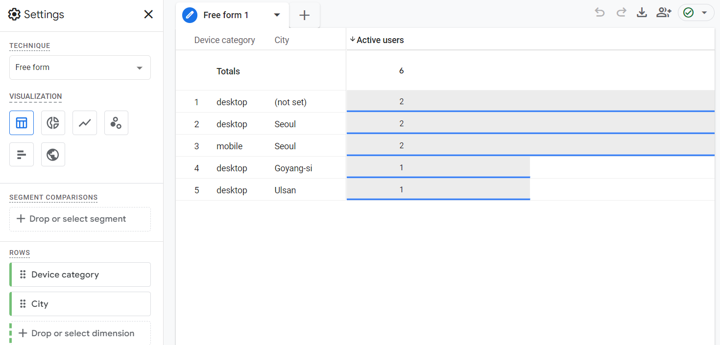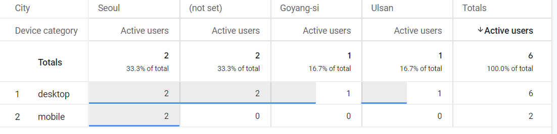 간단하게 정리해 보겠습니다. ROWS : City / COLUMNS : Device category / Value : Active users 입니다. 간혹 SQL에서 사용하는 개념으로 이해하자면, 각각의 City 데이터들의 Device category 프로퍼티의 값을 Active users 기준으로 출력한 것입니다.