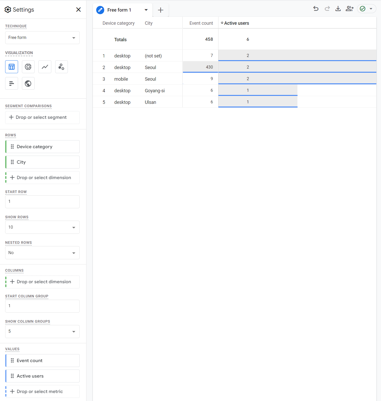 이 상태에서 VALUES에 Metric을 추가해 볼까요? Event count와 Active users가 같은 레벨로 Values에 들어가게 되면, 아래와 같은 형태의 테이블을 생성하게 됩니다.