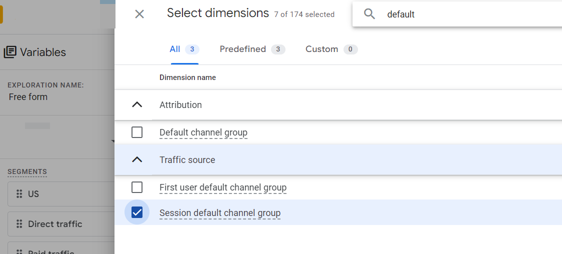 우선 Dimensions에서 [세션 기본 채널 그룹]을 추가해야 합니다.