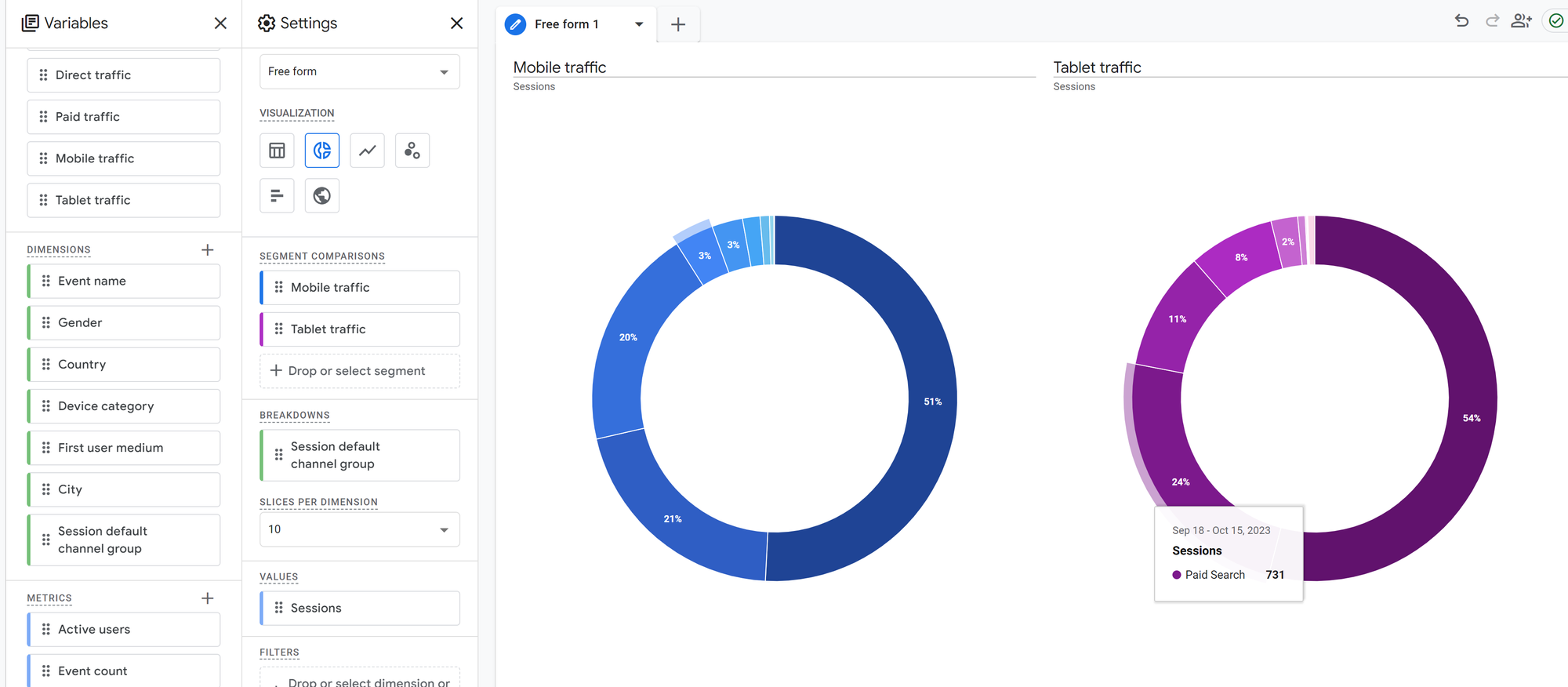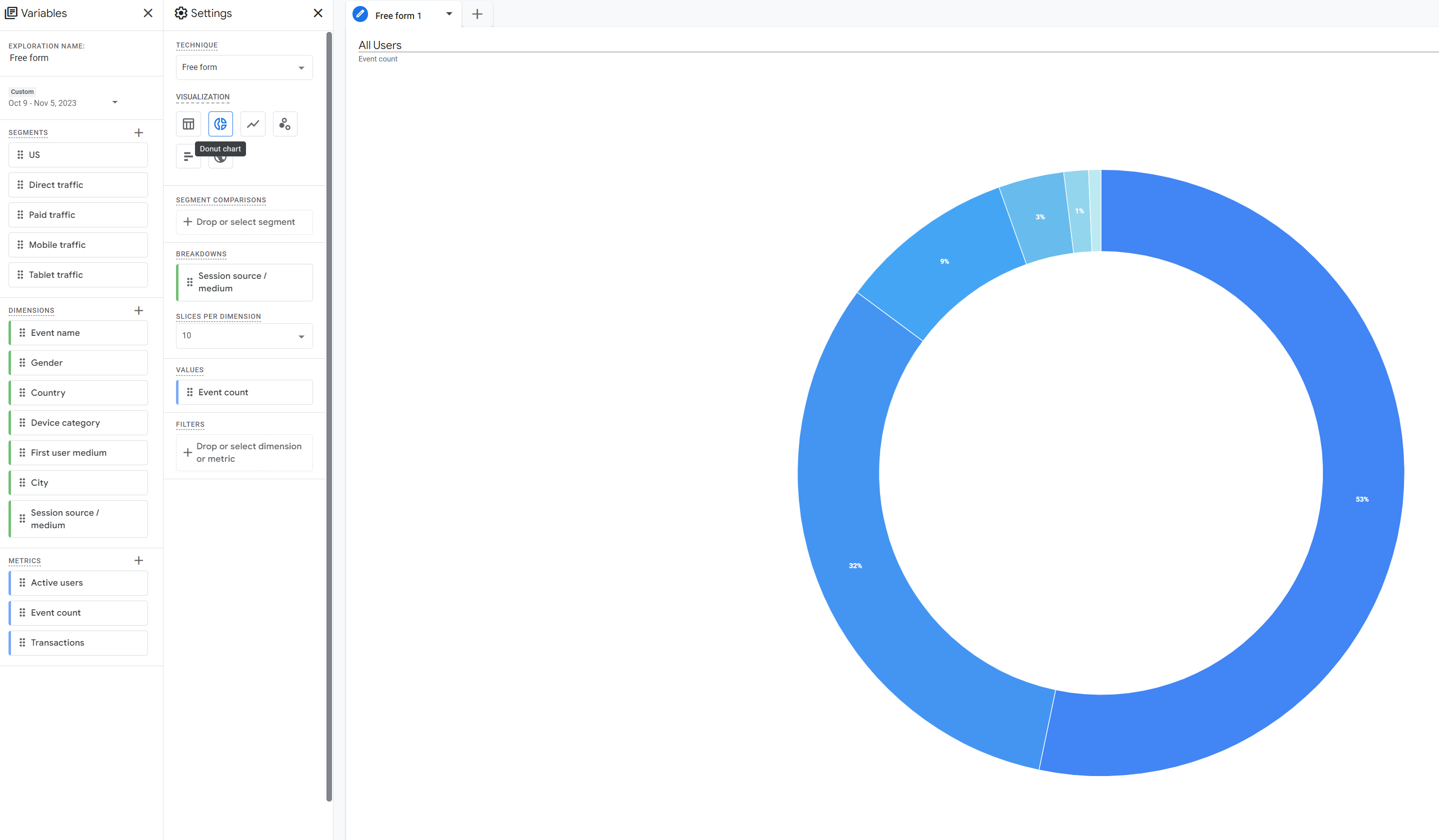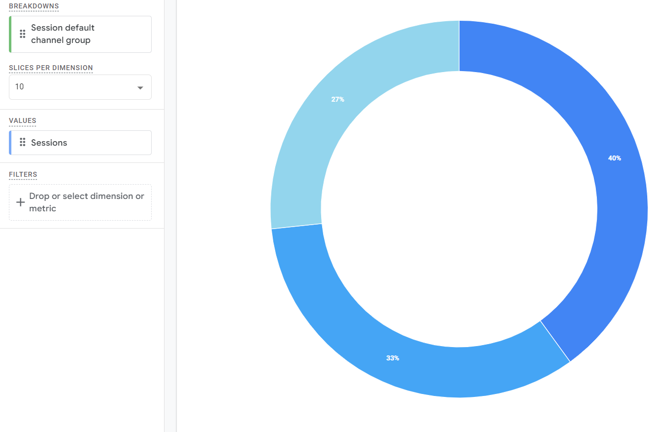 이제 Breakdowns에 세션 기본 채널 그룹을, Values에는 세션 수를 입력해 도넛 차트를 생성합니다.