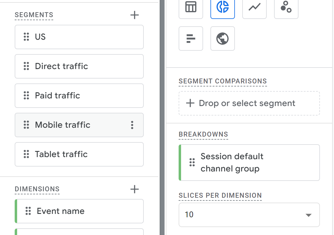 Variables 탭을 확인해 보면, [SEGMENTS] 항목이 존재하는 것을 알 수 있습니다. 그리고 Settings 탭에는 [SEGMENT COMPARISONS] 항목이 존재하지요. 간단하게 세그먼트 항목의 "Mobile traffic"과 "Tablet traffic"을 세그먼트 비교 항목으로 이동해 줍니다.