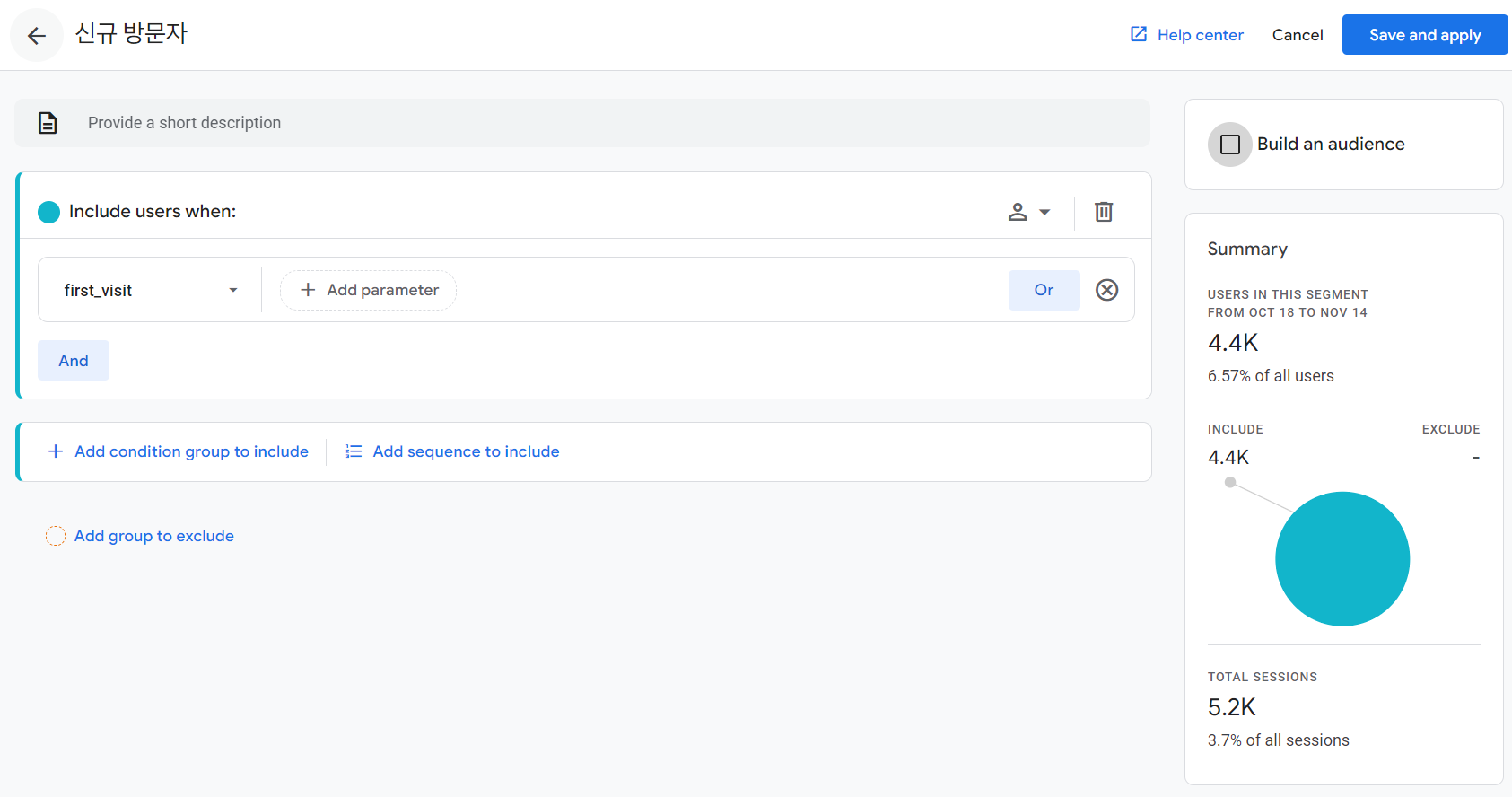 신규 방문자를 생성해 보겠습니다. 신규 방문자는 별다른 조건 없이 이벤트 first_visit을 만족하면 됩니다. fisrt_visit을 등록하고, [신규 방문자]라는 이름을 붙여 저장합니다.