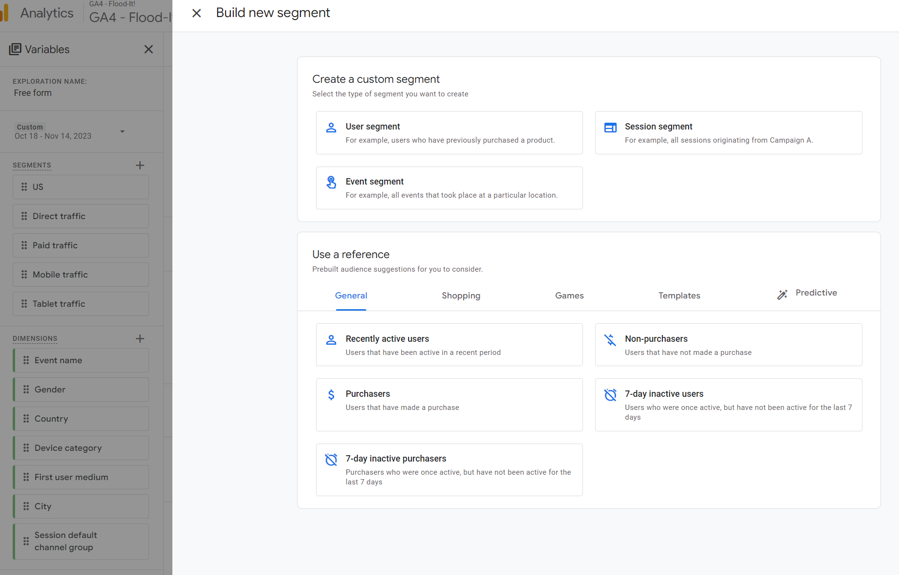 이제 세그먼트를 적용하여 데이터를 비교할 수 있는 것도 이해했습니다. 이제 그럼 원하는 유저 세그먼트를 직접 세팅하여 비교해 보도록 하겠습니다. 사용자 수를 확보하기 위해서, 데모 계정 중 [Flood it!] 속성으로 진행해 보겠습니다. 우선 해당 속성에서 Free form을 실행하고 Metrics에 Sessions를 추가해 Value로 지정하고, Dimensions는 Session default channel group으로 지정해 위의 예시와 똑같이 만들어 주겠습니다.