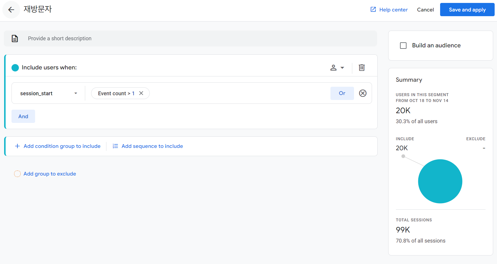 재방문자는 이보다는 좀 더 복잡한 조건을 정의해야 합니다. 단순히 특정 이벤트 조건을 만족하는 것이 아니라, 스스로 유저를 정의해야 합니다. GA4에서 '재방문'으로 정의할 수 있는 조건은, 이벤트 중 sessions_start를 발생시키고 나서 해당 이벤트 파라미터에 Event count 수를 정의해 주면 됩니다. 특히, 이 Event count의 조건이 1보다 크다고 설정하면 됩니다. 즉, 세션 수가 2가 되면 "재방문을 했다"라고 정의할 수 있기 때문입니다.