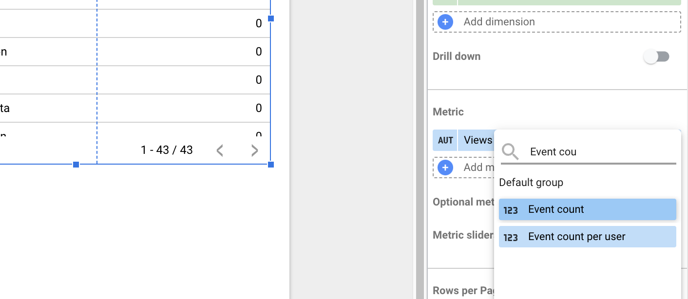 하지만, 다소 이상한 점이 있습니다. 출력되는 이벤트 중 page_view를 제외하면 대부분의 이벤트에 대한 metric이 0인 상태입니다. 왜일까요? 답은 간단합니다. dimension과 이에 대한 적합한 metric이 형성되지 않았기 때문입니다. 지금 metric이 views라고 했는데, 모든 이벤트에 views가 측정되지 않기 때문입니다.