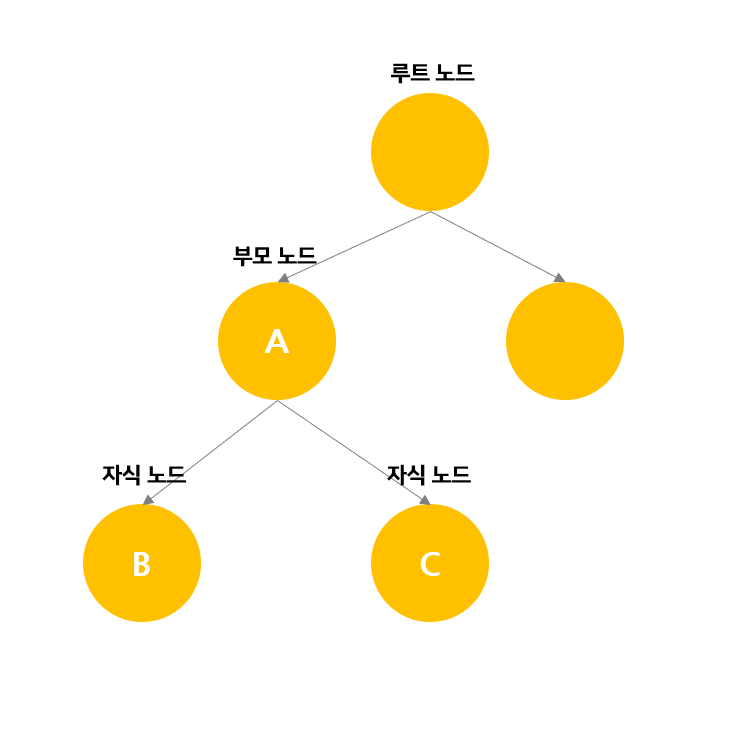 위 이미지에서의 A 노드는 B와 C의 부모 노드이고, B와 C는 A의 자식노드가 되는 것이죠.