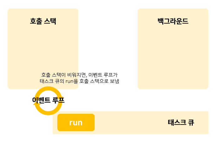 (5) 태스크 큐로 보내진 run은 이벤트 루프가 빈 호출 스택으로 보내버립니다. 호출 스택이 비어 있으면, 이벤트 루프는 태스크 큐에서 하나씩 함수를 가져와 호출 스택에 넣고 실행합니다. 참고로 이벤트 루프가 태스크 큐의 콜백 함수를 호출 스택으로 보내는 규칙은 별도로 정의되어 있습니다.
