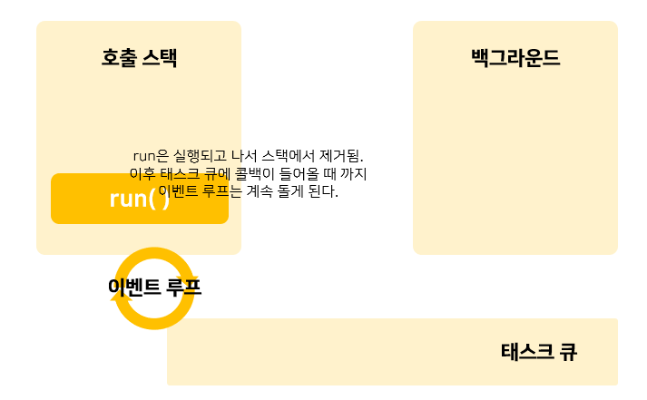 (6) run이 실행되고, 실행 완료 후 호출 스택에서 제거됩니다. 그리고 이벤트 루프는 계속 대기하며 태스크 큐에 콜백 함수가 들어오기를 기다립니다.
