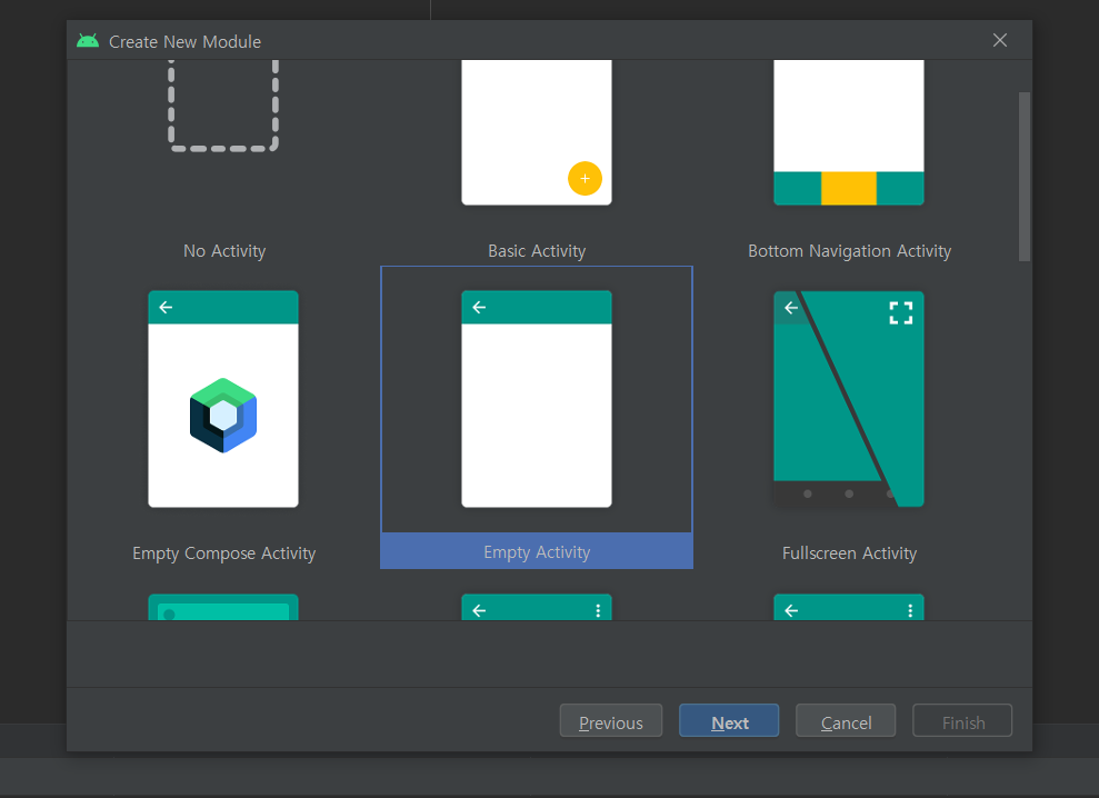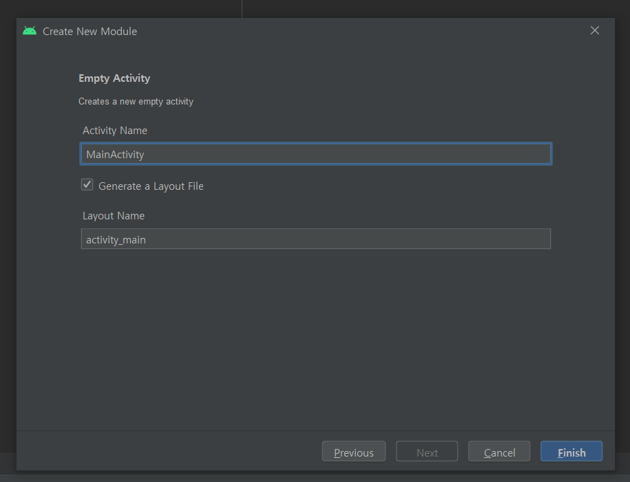 액티비티 명과 설정은 디폴트 값을 유지하고 Finish를 클릭해 모듈 생성을 완료해 봅시다.