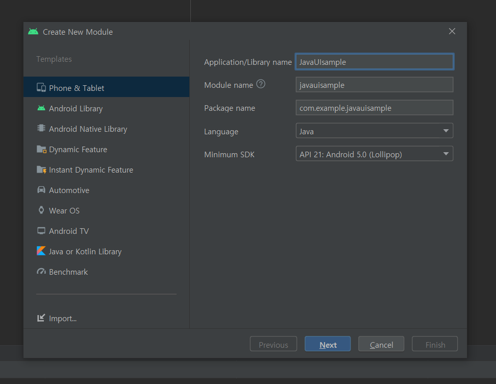 우선 Phone & Tablet 템플릿을 선택하고, Application/Library name은 JavaUISample로 지정해 보았습니다.