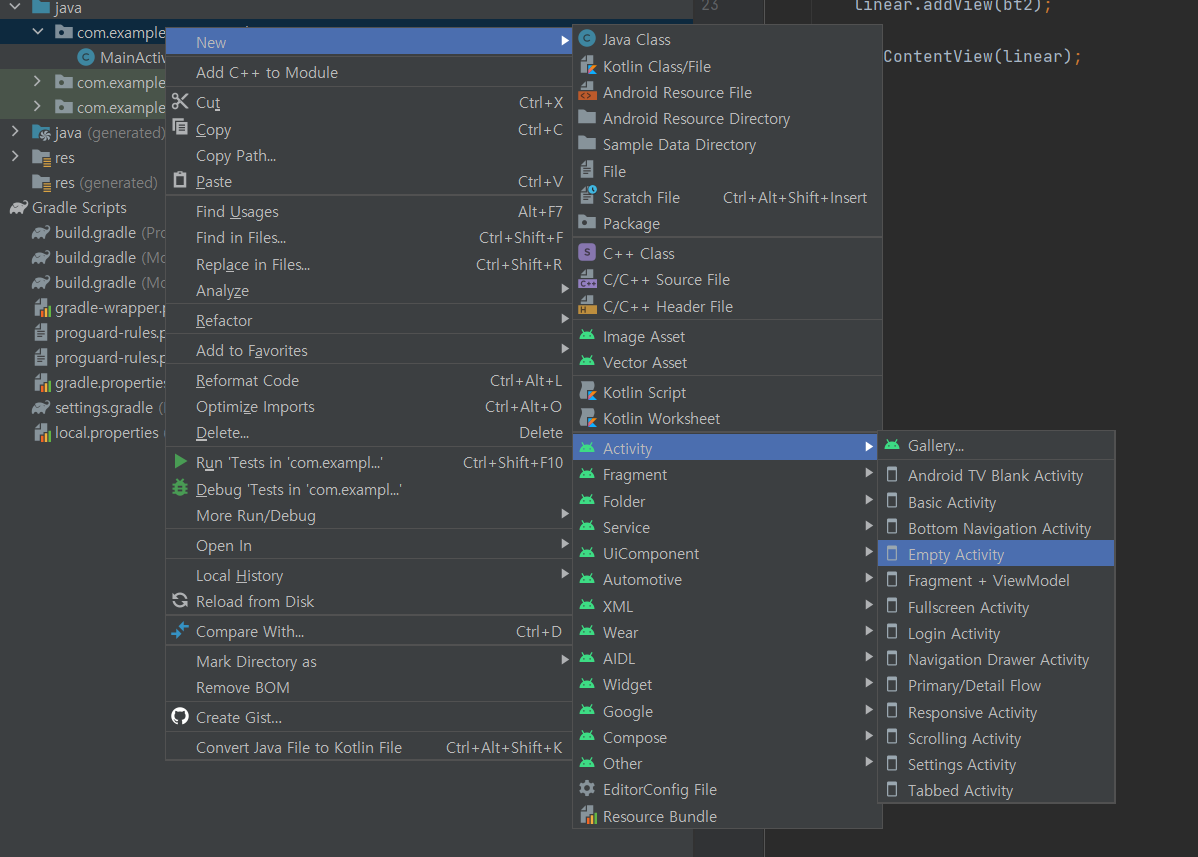 이번에는 익숙한(?) 방식인 XML을 사용해 UI를 구성하는 방법에 대해서 살펴보도록 하겠습니다. 이번에는 이전 아티클에서 생성했던 모듈에서, MainActivity는 그대로 두고 새로운 액티비티를 추가로 생성해서 진행해 보겠습니다. 프로젝트 메뉴에서 패키지명 com.example.javauisample을 우클릭하고, [New > Activity > Empty Activity]를 선택합니다.