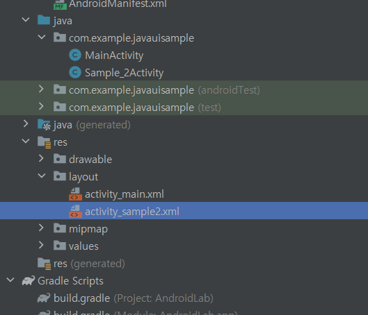 이렇게 Finish를 클릭해 생성을 완료합니다. 이제 [res > layout > activity_sample2.xml] 파일을 편집하겠습니다. 이때 XML 파일을 작성하는 방식에는 디자인 모드와 코드 모드가 있습니다. 우선 여기서는 두 개의 화면이 모두 나오는 스플릿 모드를 사용합니다.