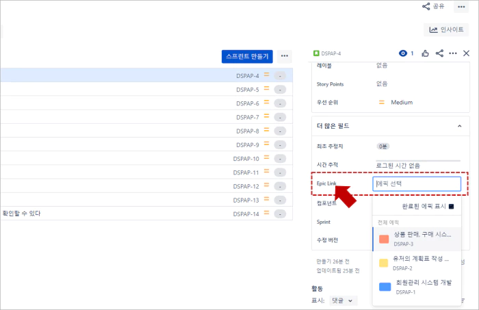 위 이미지처럼 백로그 중 하나의 이슈를 클릭해, 해당 이슈의 속성을 보면 Epic Link 항목을 찾을 수 있습니다. 여기서 하나의 에픽을 선택하여 에픽 연결을 완료해 줍니다. 다른 이슈들도 동일한 방식으로 각각의 Epic Link 항목에서 지정해 주도록 합시다.