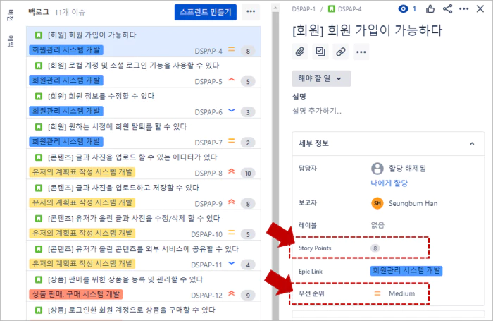 위 이미지에서 보시는 것 처럼, 각각의 이슈에서 Story Point와 우선 순위 항목을 지정하고 나면, 백로그의 이슈 리스트에서도 우선순위와 Story Point가 표시됩니다.