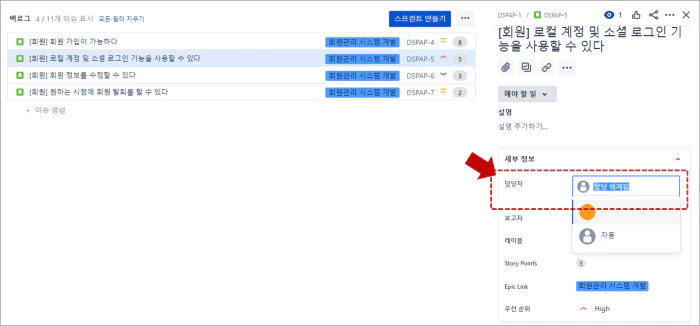 팀원에 대한 업무의 배정은 앞으로 이슈가 지속적으로 생성되거나 관리하는 과정에서 많이 사용하게 될 것입니다. 백로그 아이템 개별로 해당 업무를 책임지고 수행할 담당자를 지정하여, 해당 업무에 대한 히스토리를 관리할 인력을 지정해 봅시다.