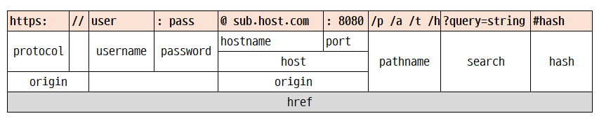 일단, 아래 그림과 같이 WHATWG와 노드의 주소 체계 구조를 살펴보겠습니다. 우리가 흔히 알고 있는 url 주소가 WHATWG에서 어떤 범위로 구분되는지를 이해하면 됩니다.