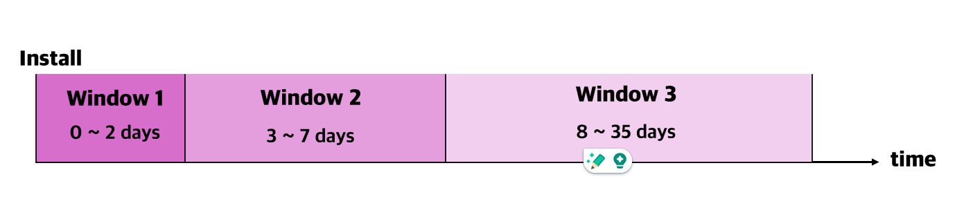 SKAN에서 말하는 전환 윈도우(Conversion Window)는 이를테면 전환 값을 기록하는 기간의 분류를 의미합니다. 이 기간을 측정하는 기준점은 해당 앱이 설치(Install)된 시점을 의미하게 됩니다.