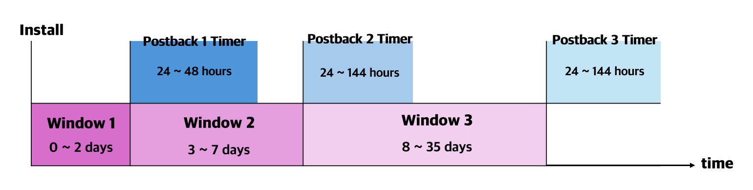 예를 들어 앱이 설치된 후, Window 1에서 수집된 포스트백이 전송되는 실제 기간은 Postback 1 타이머가 작동되는 시간에 랜덤하게 전송됩니다. 실제 인스톨이 발생한 시점으로부터는 72시간 ~ 96시간 사이에 랜덤하게 전송된다는 의미가 됩니다(인스톨 후 0 ~ 2일간 수집된 데이터는 3 ~ 4일차에 전송됨)