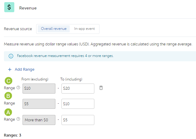 말 그대로 앱 내에서 발생하는 수익을 측정하는 전환값입니다. 아래 이미지와 같이 범위(Range)를 설정하는 방식인데, 수익의 범위들은 공백 없이 연속적으로 설정하는 것이 원칙이며 메타 광고에서는 4개 이상의 범위를 설정해야 합니다.