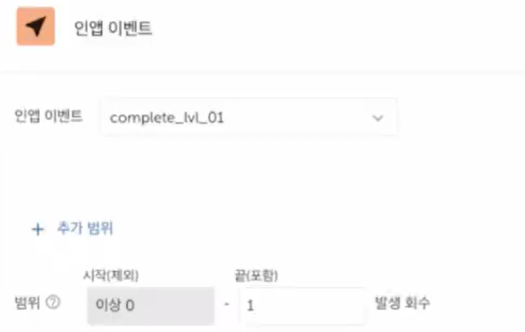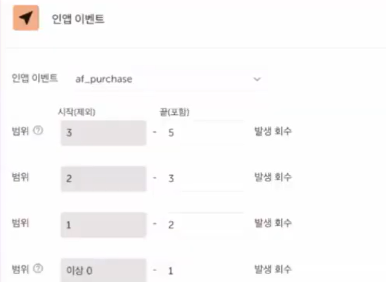 앱 내에 구현해둔 인앱 이벤트 역시 측정 가능합니다. 미리 앱에 구현해둔 이벤트를 선택하고 범위(range)를 설정하게 되는데 크게 두 가지 유형을 선택하게 됩니다.