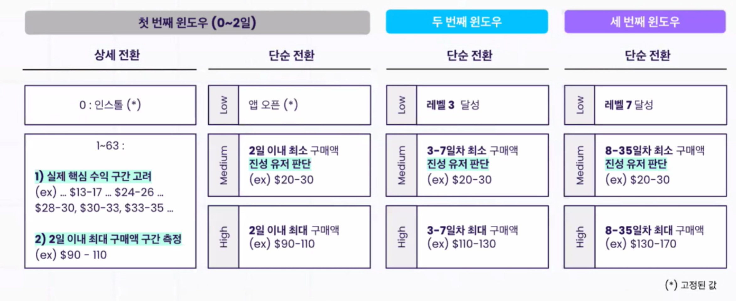 여기서 두 번째 윈도우, 세 번째 윈도우의 경우에도 MEDIUM에서는 진성 유저 여부, HIGH에서는 최대 구매액 달성 여부를 체크합니다(HIGH의 경우 2일을 초과했으므로 최대 구매액 구간을 조금씩 증대합니다). 더불어 이 기간에는 LOW에 레벨 달성 여부 등을 할당하여, 수익이 발생하지 않았을 경우의 차선 KPI를 측정할 수 있도록 설정합니다.