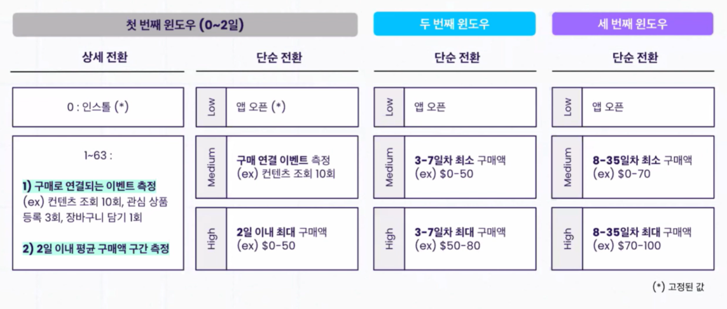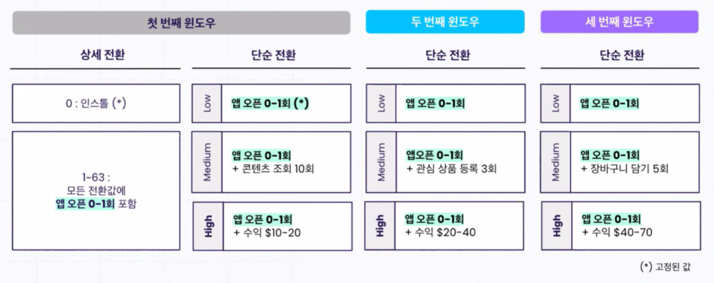 첫 번째 윈도우에서 구매가 발생하기는 하지만 주요 구매 기간이 아니기 때문에, 이 경우에는 기존 데이터를 분석하여 고관여 이벤트를 먼저 설정하게 됩니다. 즉, 구매 이벤트 발생 직전에 카운팅되는 이벤트를 분석하여 할당합니다. 장바구니 담기 액션 횟수, 좋아요나 즐겨찾기 실행 횟수, 상품 조회 횟수 등이 있을 것입니다. 여기에 2일 이내의 평균 구매 금액도 함께 설정할 수 있습니다. 단순 전환 값의 경우에도 MEDIUM에는 구매 연결 이벤트(주요 이벤트 1개), HIGH에는 2일 이내 발생 최대 구매액을 할당하게 됩니다. 이후의 윈도우 기간에는 MEDIUM과 HIGH에 최소 구매액 구간과 최대 구매액 구간을 설정해 줍니다.