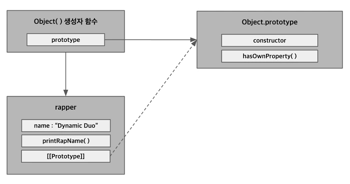 위의 예제 케이스를 통해 설명해 볼까요? console.log(rapper.hasOwnProperty('rapName')); 라는 라인에서 rapper.hasOwnProperty라는 메서드를 실행했습니다. 이 경우, 우선 rapper라는 객체 안에서 해당 메서드가 있는지를 검색합니다. 하지만 우리가 잘 알다시피 이런 메서드는 rapper 객체 안에 선언되어 있지 않습니다. 그러면 이 경우, 프로토타입 체이닝 원칙에 따라 rapper객체의 [[Prototype]] 링크를 따라 부모 객체를 찾아갑니다.