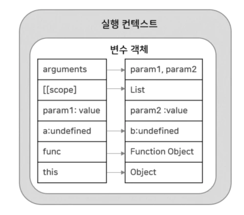 위의 코드 실행을 통해, 실행 컨텍스트의 변수 객체가 생성이 완료되면 아래 그림과 같은 구조를 형성하게 됩니다. 이미 설명했던 내용이지만, 현 단계에서 초기화는 이루어지지 않은 상태입니다.