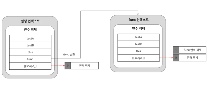 이제 이 코드에서 어떤 일이 벌어지는지를 차근차근 살펴보겠습니다. 우선 func( )라는 함수가 실행되었으므로 새로운 func 실행 컨텍스트가 생성됩니다. 여기에는 func( ) 함수가 가진 변수들이 생성되겠죠? 변수명은 동일한 testA, testB 입니다. 그럼 여기서 주의해서 봐야 할 부분은 func 컨텍스트의 변수 객체가 갖게 되는 [[scope]] 입니다.