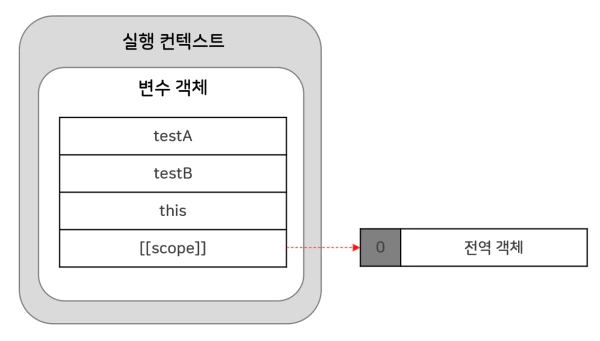 우선 소스 파일에 위의 코드만 작성되었다고 가정하면, 별도의 함수는 선언되거나 실행되지 않고 두 개의 변수 testA 그리고 testB만 선언된 상태입니다. 그리고 두 개의 변수를 출력하는 코드만 작성되어 있습니다. 이 상태에서 코드가 실행된다면, 단 하나의 실행 컨텍스트와 변수 객체만 만들어지게 됩니다. 이 상태에서 만들어지는 그 하나의 실행 컨텍스트는 자체가 최상위 컨텍스트인 '전역 컨텍스트'가 됩니다.